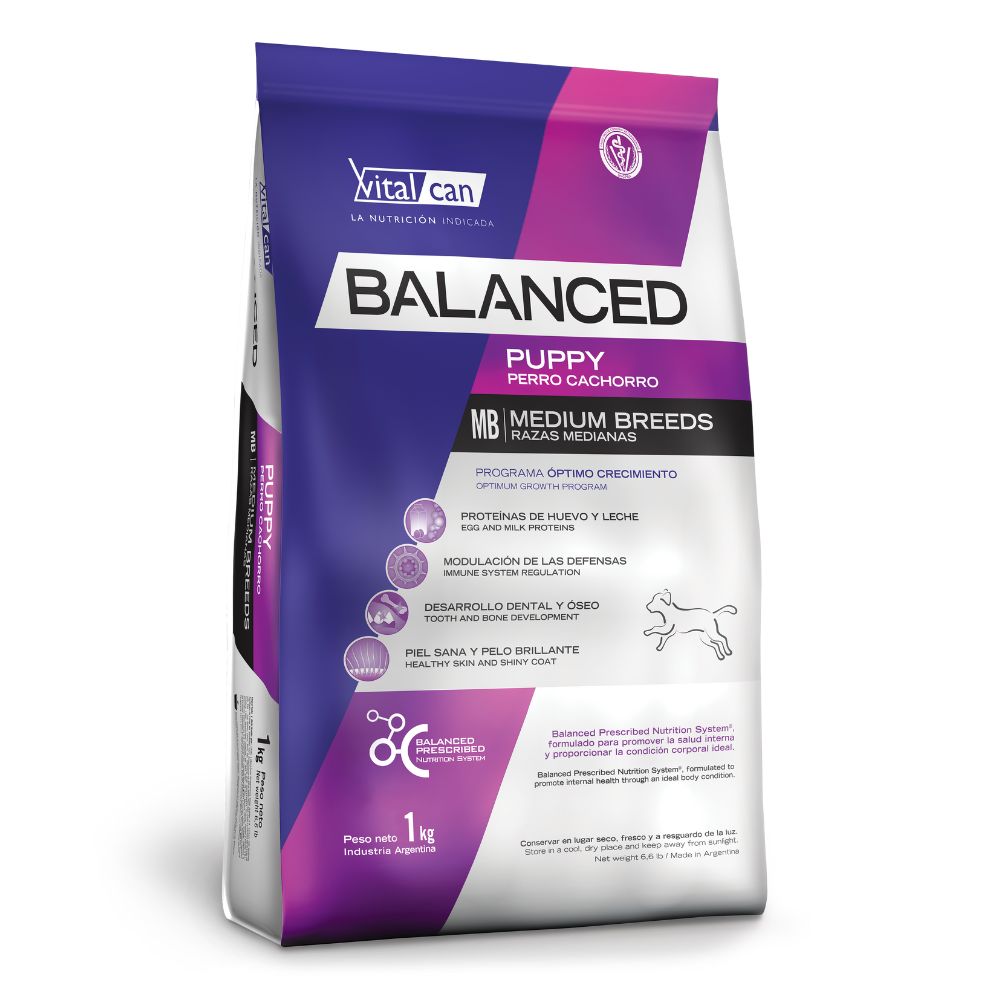 Vitalcan Balanced Puppy está diseñado para cubrir las necesidades nutricionales específicas de los cachorros de razas medianas. Su Programa Óptimo Crecimiento incluye proteínas de alta digestibilidad (huevo y leche), DHA para el desarrollo cerebral, y antioxidantes naturales que promueven un sistema inmunológico fuerte. Además, contiene fibras naturales que favorecen una digestión saludable y nutrientes que contribuyen al desarrollo dental y óseo.