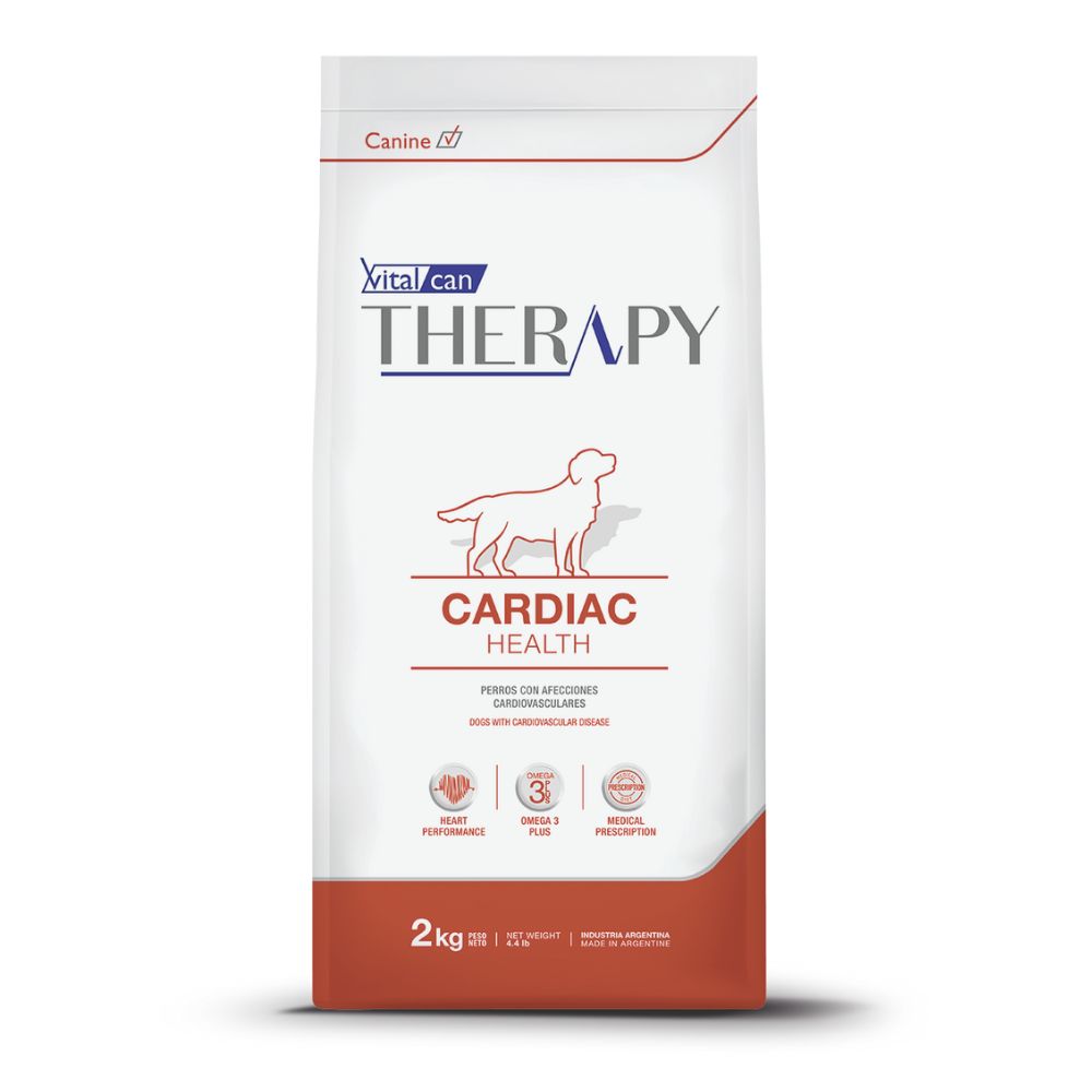 Vitalcan Therapy Cardiac Health para perros de todas las edades con insuficiencia cardíaca, miocardiopatía, hipertensión o edemas. Proteínas de alto valor biológico, bajos niveles de sodio, taurina y L-carnitina para proteger el músculo cardíaco. Omega 3 ayuda a reducir inflamación y mejorar circulación. Alta palatabilidad.