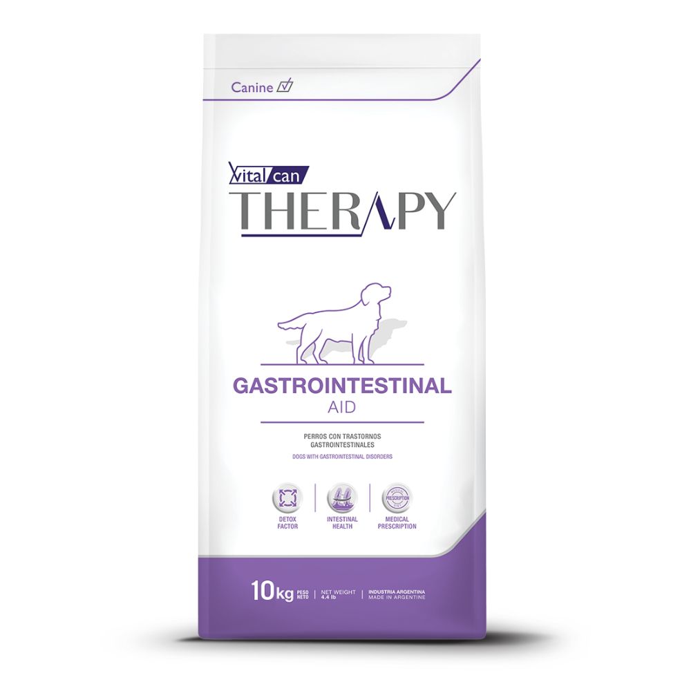 Vitalcan Therapy Gastrointestinal Aid para perros de todas las edades con trastornos gastrointestinales como diarreas, vómitos, colitis. Ingredientes altamente digestibles, glutamina para regenerar mucosa intestinal, extracto de alcachofa y zeolita como detoxificantes. Omega 3 con efecto antiinflamatorio.