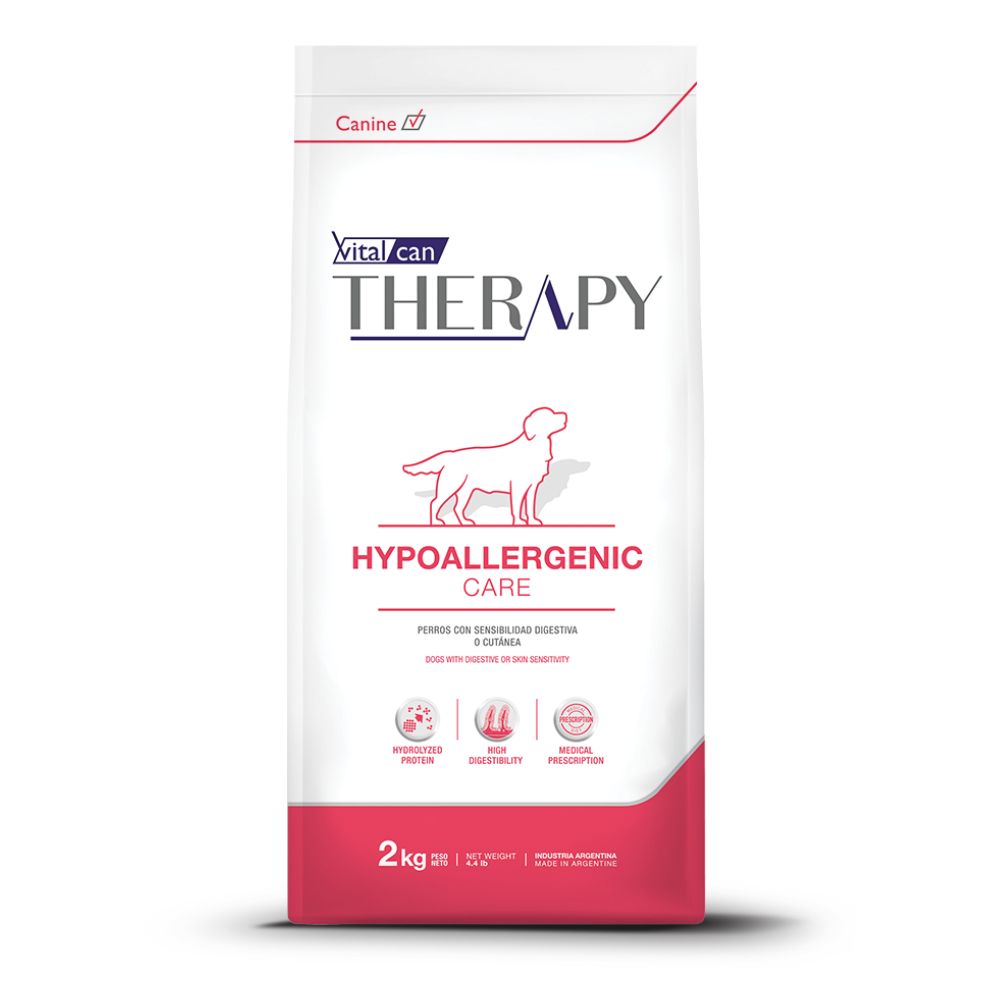 Vitalcan Therapy Hypoallergenic Care para perros de todas las edades con alergias alimentarias o sensibilidad digestiva/cutánea. Proteína hidrolizada de bajo peso molecular, carbohidratos altamente digestibles como papa y mandioca. Omega 3 para salud cutánea e intestinal.