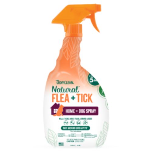 TropiClean® Natural Flea & Tick Home + Dog Spray Este spray de máxima fuerza puede usarse directamente sobre el pelaje del perro (a partir de 12 semanas) y también en camas, muebles, alfombras y superficies del hogar, brindando protección continua tanto para la mascota como para su entorno.